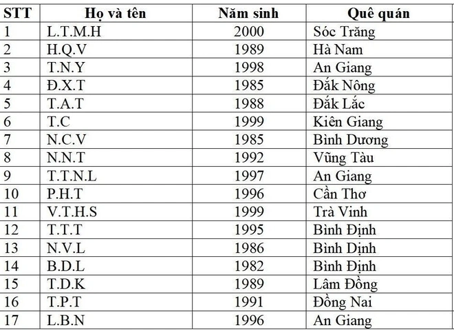Danh tính 17 nạn nhân (viết tắt) còn lại trong vụ cháy. Ảnh: Cơ quan chức năng cung cấp.