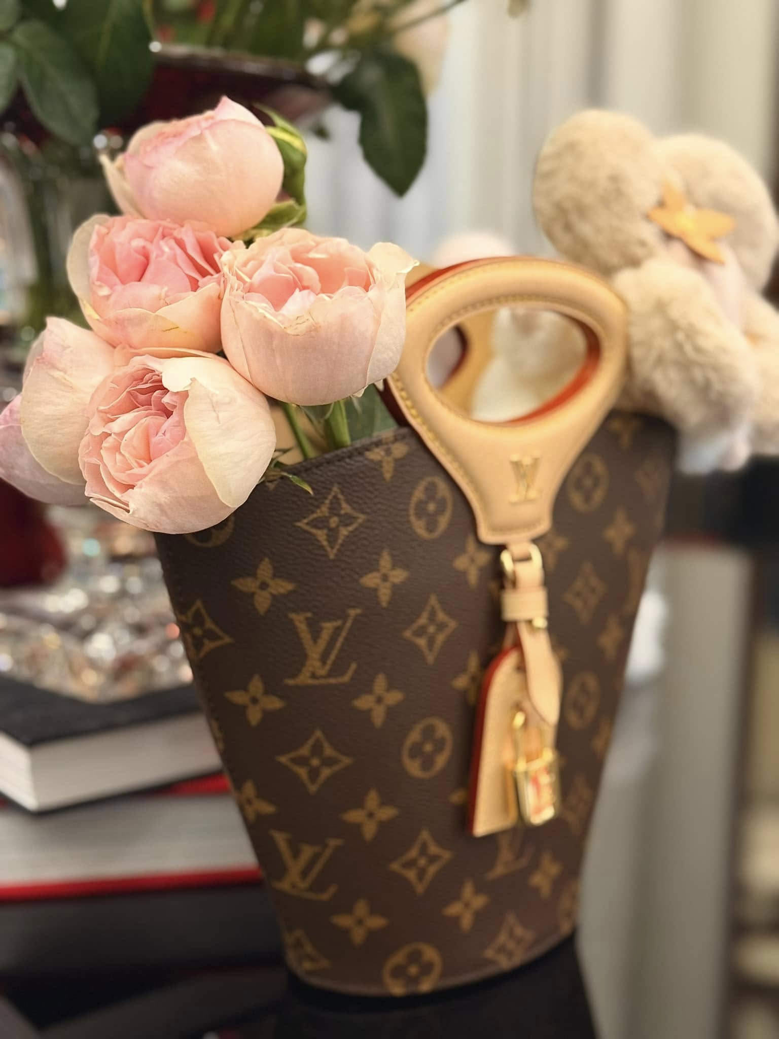 Đoàn Di Băng chưa có cơ hội xách chiếc túi vì ít ra ngoài do vấn đề sức khỏe. Cô dùng món đồ hiệu 70 triệu này chỉ để cắm hoa giả trưng bày trong nhà. Món phụ kiện để trên bàn cùng nhiều đồ trang trí hàng hiệu khác như loa, gấu bông... cũng của Louis Vuitton.