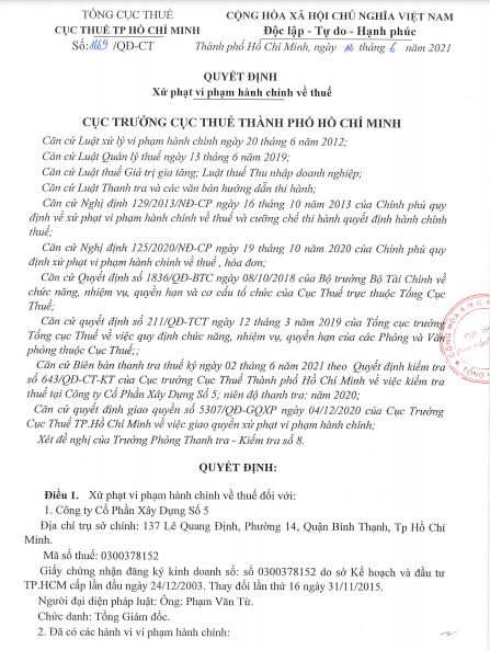 CTCP Xây dựng số 5 (MCK: SC5) vừa nhận quyết định xử phạt vi phạm hành chính về thuế của Cục Thuế TP HCM.