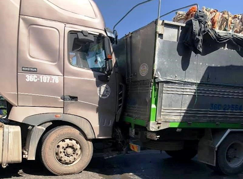 Lúc đó, các xe chạy sau cũng đồng loạt phanh gấp. Trong đó, tài xế ô tô tải 36C- 225.54 chạy ngay sau xe đầu kéo đạp thắng, bị xe tải 36C-107.76 chạy nối đuôi phía sau đâm vào; một xe container khác tông vào ô tô biển xanh 80A.