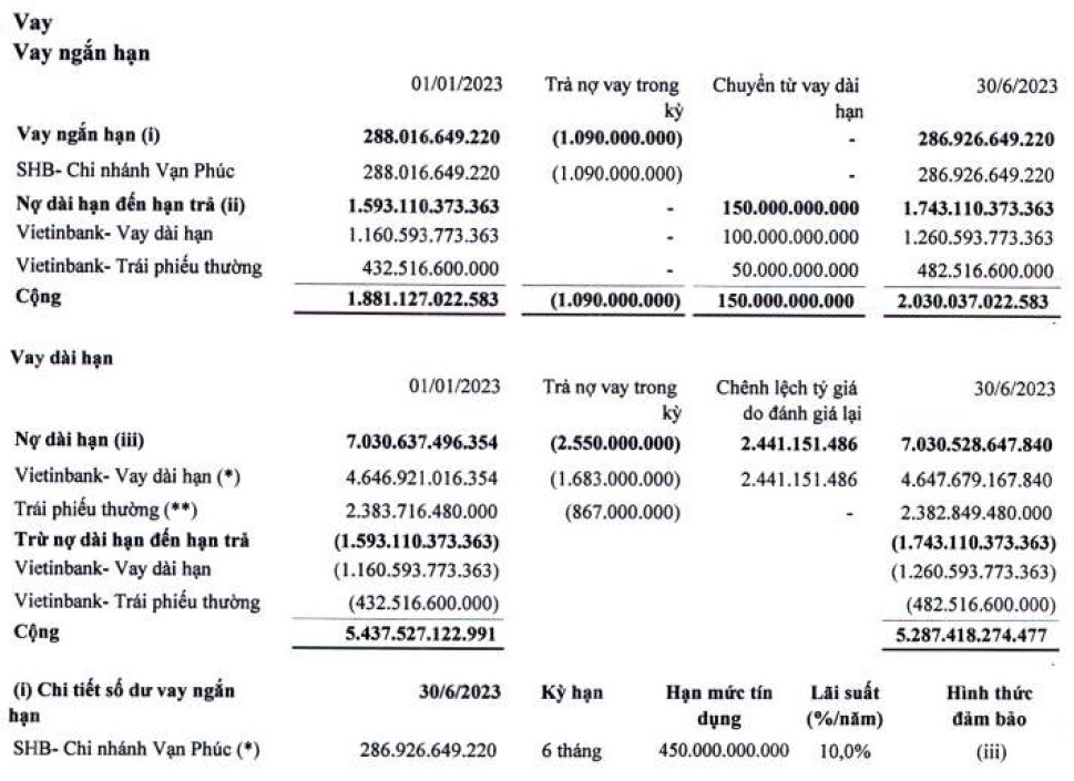Chi tiết các khoản vay của Xi Măng Công Thanh. Nguồn: Báo cáo tài chính soát xét bán niên 2023