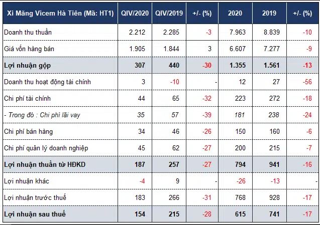 Báo cáo tài chính hợp nhất quý IV/2020 của CTCP Xi Măng Vicem Hà Tiên (Mã: HT1) cho thấy, công ty này lãi 154 tỷ đồng trong quý cuối năm, giảm 28% so với cùng kỳ năm 2019.
