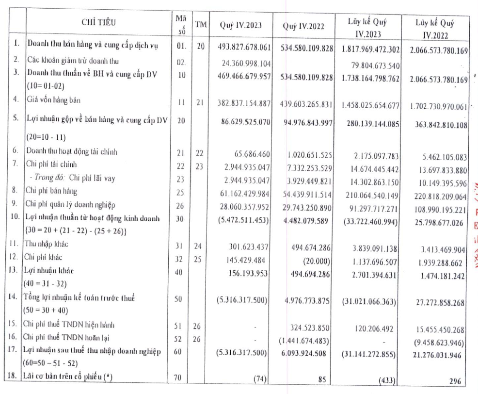 Kết quả, Vicem Hoàng Mai báo lỗ ròng hơn 5 tỷ đồng, trong khi cùng kỳ lãi hơn 6 tỷ đồng. Trước đó trong quý 3/2023, Công ty báo lỗ hơn 26 tỷ đồng.