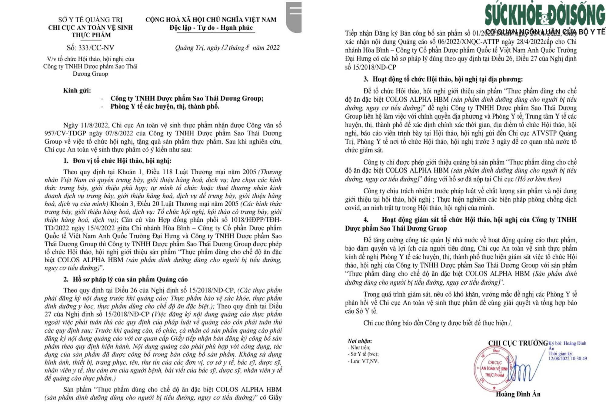 Công văn của Chi cục An toàn vệ sinh thực phẩm tỉnh Quảng Trị gửi Công ty TNHH Dược phẩm Sao Thái Dương Group ngày 12/8.