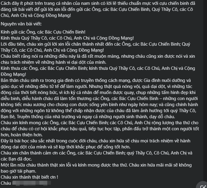 Nhưng thật quá nóng vội, quá dại dột, vì những tác động của thời tiết nóng bức, vì ích kỷ cá nhân để muốn được quay, chụp những tấm hình đẹp khi diễu binh, diễu hành, cháu đã làm tổn thương các ông, các bác cựu chiến binh – những con người không tiếc máu xương cho chúng con được sống yên bình như ngày hôm nay; và cũng chính hành động với những ngôn từ không thể chấp nhận được của cháu đã làm ảnh hướng tới quý thầy cô, bạn bè, truyền thống của nhà trường và ngay cả những người sinh thành, dạy dỗ cháu.
