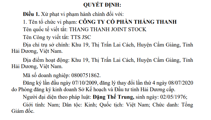 Theo đó, Công ty Cổ phần Thắng Thanh Đã thực hiện hành vi vi phạm hành chính và bị áp dụng hình thức xử phạt, biện pháp khắc phục hậu quả như sau: Đưa hạng mục công trình, công trình vào sử dụng, hoạt động khi chưa có giấy chứng nhận hoặc văn bản thẩm duyệt thiết kế về phòng cháy và chữa cháy.