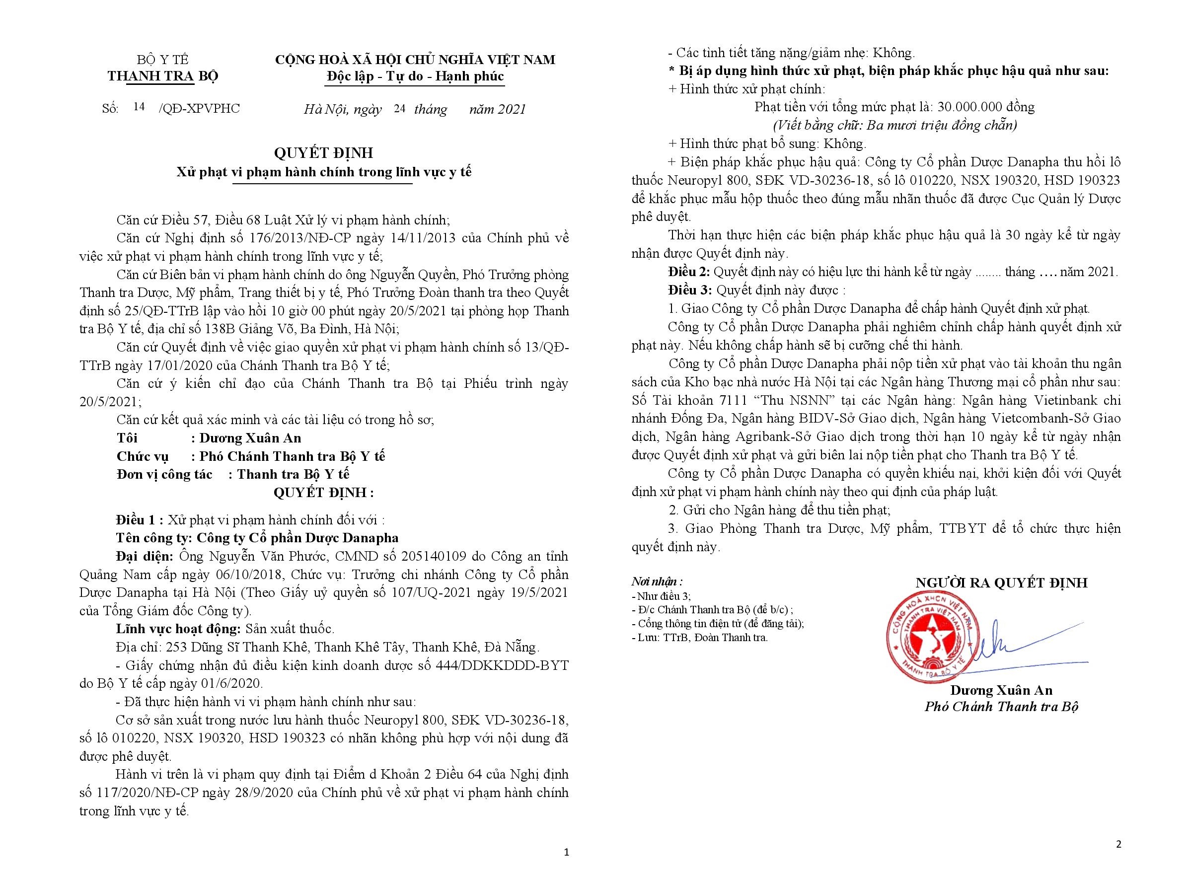 Ngày 24/05/2021, Thanh tra Bộ Y tế ban hành Quyết định số 14/QĐ-XPVPHC về việc xử phạt vi phạm hành chính đối với Công ty cổ phần Dược Danapha có địa chỉ tại số 253 Dũng Sĩ Thanh Khê, Thanh Khê Tây, Thanh Khê, Đà Nẵng. Người đại diện pháp luật: Nguyễn Văn Phước - Trưởng chi nhánh Công ty Cổ phần Dược Danapha tại Hà Nội.