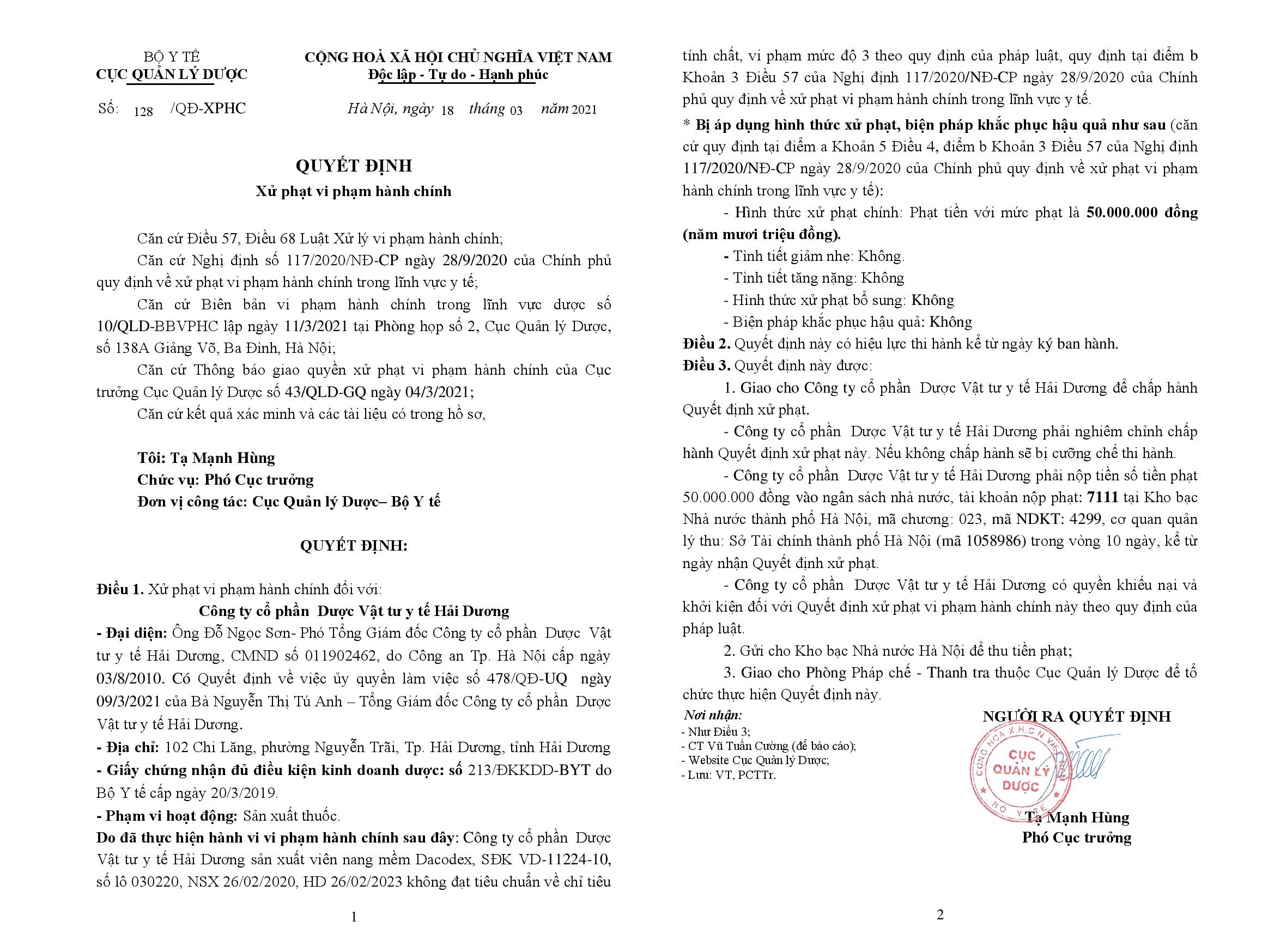 Đến ngày 18/03/2020, Cục Quản lý Dược đã ban hành quyết định xử phạt vi phạm hành chính số 128/QĐ-XPHC đối với Công ty cổ phần Dược Vật tư y tế Hải Dương do đã thực hiện hành vi sản xuất thuốc không đạt tiêu chuẩn, vi phạm mức độ 3. Mức xử phạt là 50.000.000 đồng.