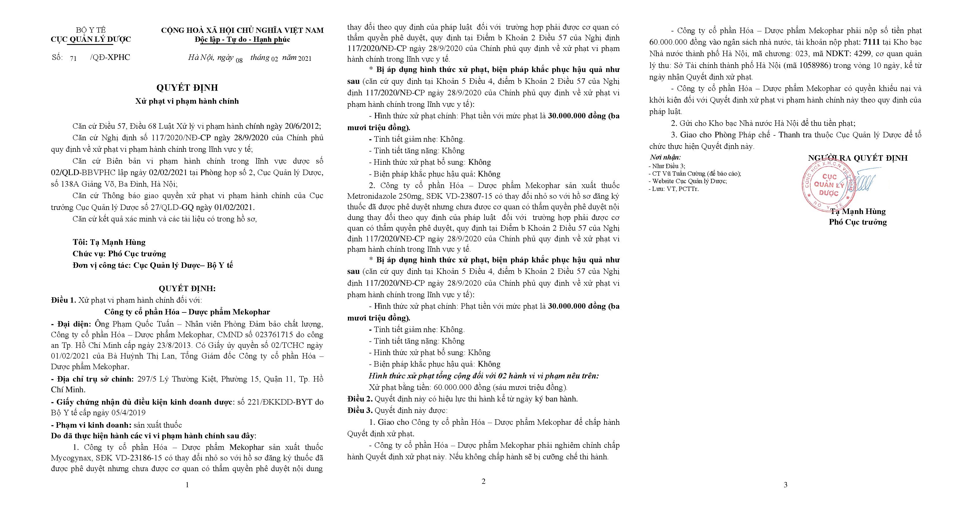 Quyết định xử phạt số 71/QĐ-XPHC do Cục Quản lý Dược ban hành nêu rõ, Công ty cổ phần Hóa-Dược phẩm Mekophar phải nghiêm chỉnh chấp hành Quyết định xử phạt. Nếu không chấp hành sẽ bị cưỡng chế thi hành.
