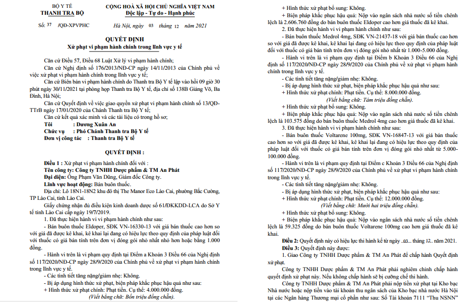 Cụ thể, theo nội dung Quyết định số 37/QĐXPVPHC do Phó Chánh Thanh tra Bộ Y tế Dương Xuân An ký ngày 3/12, xử phạt Công ty TNHH Dược phẩm & TM An Phát đã bán buôn thuốc Eldoper, SĐK VN-16330-13 với giá cao hơn giá đã kê khai, kê khai lại đang có hiệu lực theo quy định của pháp luật đối với thuốc có giá bán tính trên đơn vị đóng gói nhỏ nhất nhỏ hơn hoặc bằng 1.000 đồng. Với hành vi vi phạm này, công ty bị xử phạt 4 triệu đồng.