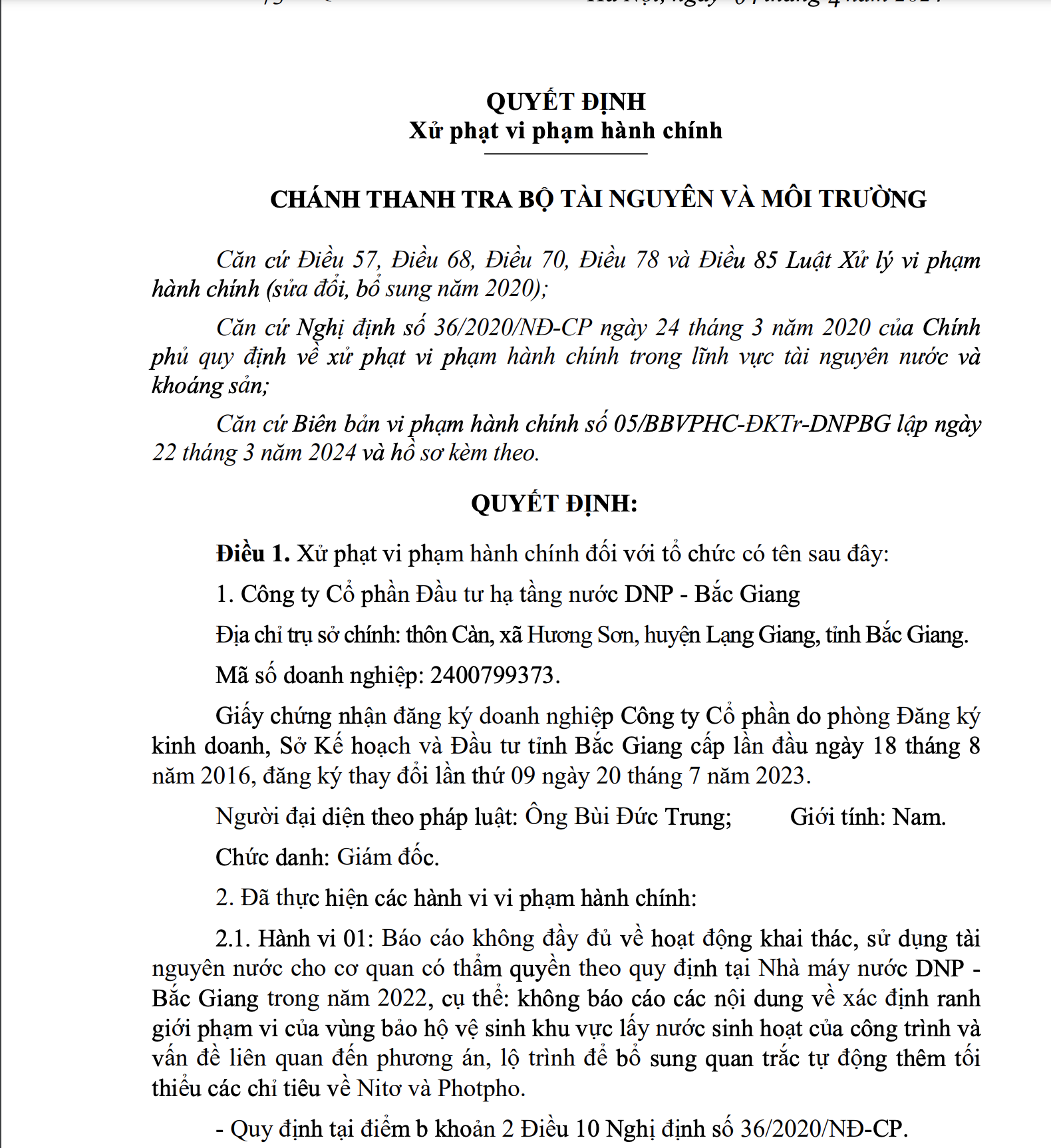 Theo quyết định xử phạt của Thanh tra Bộ Tài nguyên và Môi trường, Công ty Cổ phần Đầu tư hạ tầng nước DNP - Bắc Giang đã thục hiện hành vi vi phạm do báo cáo không đầy đủ về hoạt động khai thác, sử dụng tài nguyên nước cho cơ quan có thẩm quyền theo quy định tại Nhà máy nước DNP - Bắc Giang trong năm 2022, cụ thể: không báo cáo các nội dung về xác định ranh giới phạm vi của vùng bảo hộ vệ sinh khu vực lấy nước sinh hoạt của công trình và vấn đề liên quan đến phương án, lộ trình để bổ sung quan trắc tự động thêm tối thiểu các chỉ tiêu về Nitơ và Photpho.