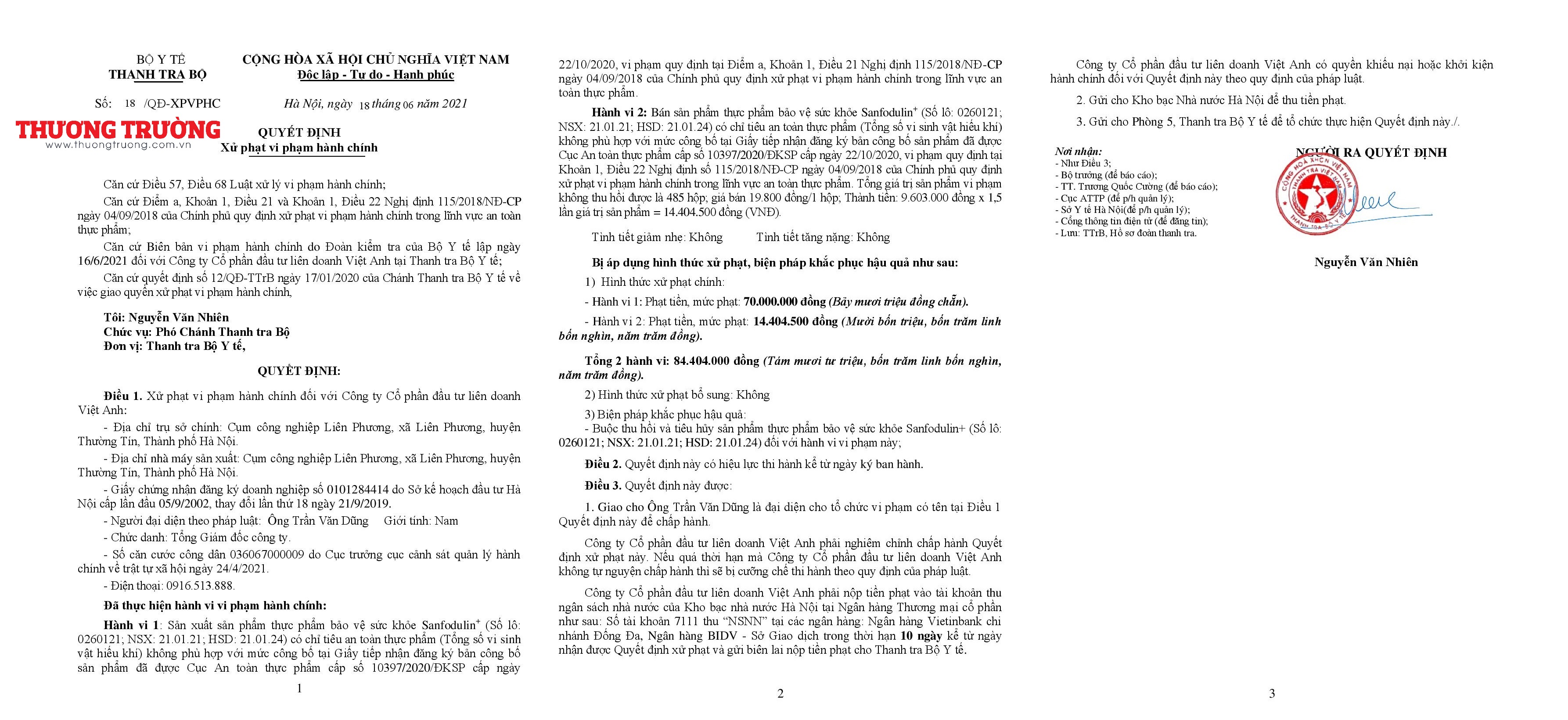 Đến ngày 18/06, Phó Thanh tra Bộ Y tế đã ký quyết định số 18/QĐ-XPVPHC, xử phạt vi phạm hành chính đối với Công ty Cổ phần đầu tư liên doanh Việt Anh.