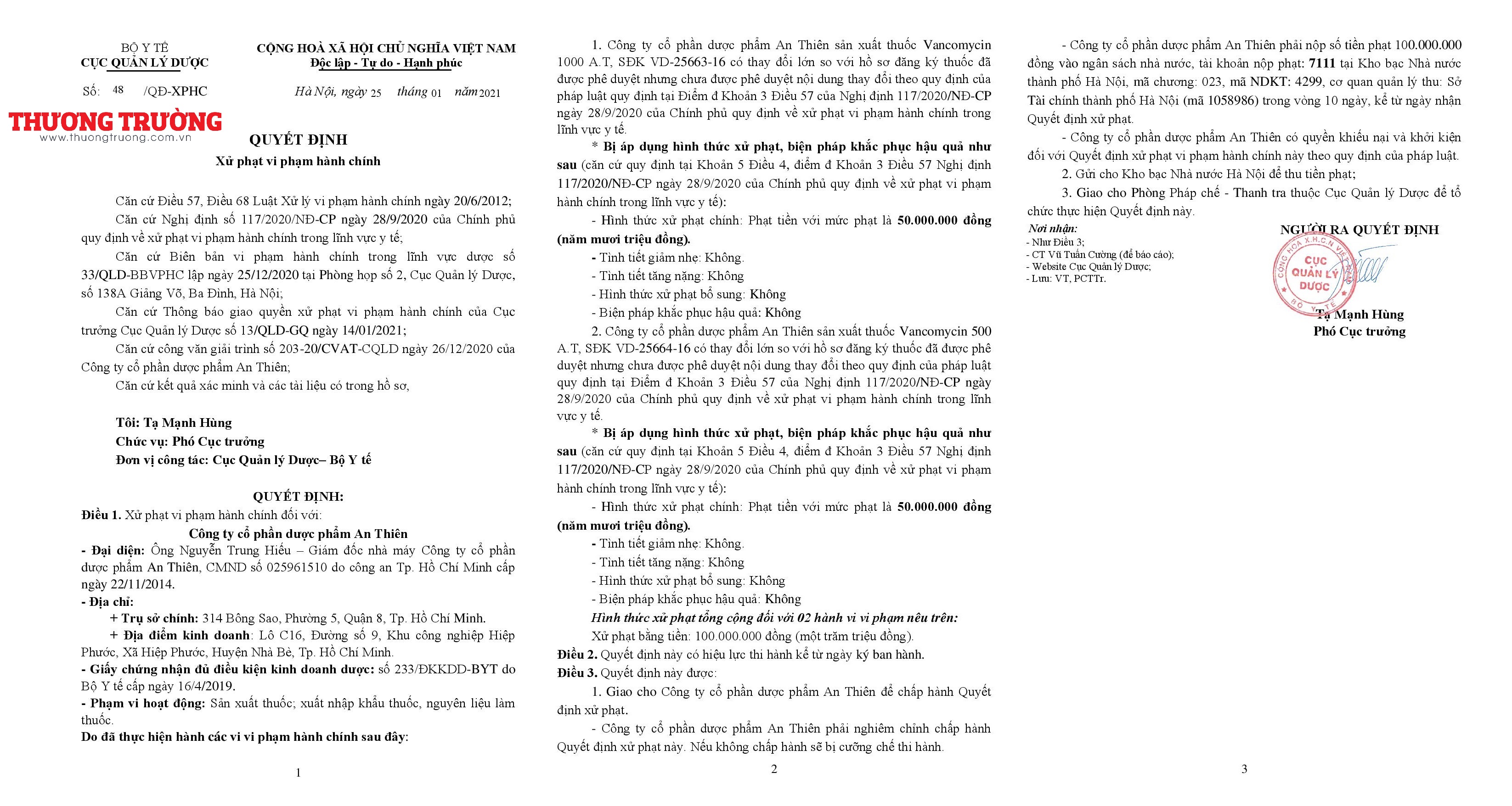 Quyết định xử phạt vi phạm hành chính đối với Dược phẩm An Thiên ban hành ngày 25/01/2021.