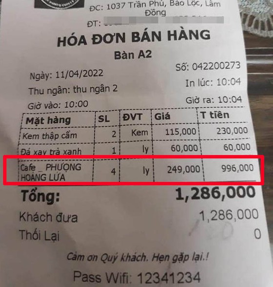Tuy nhiên, chiều 21/4, khi làm việc với Đội Cảnh sát Kinh tế Công an TP Bảo Lộc và Công an phường Lộc Tiến, ông H. đã thừa nhận hóa đơn 4 ly cà phê “Phượng hoàng lửa” với tổng số tiền 28,8 triệu đồng là do ông tự in rồi đăng tải lên trang cá nhân của mình để câu like.