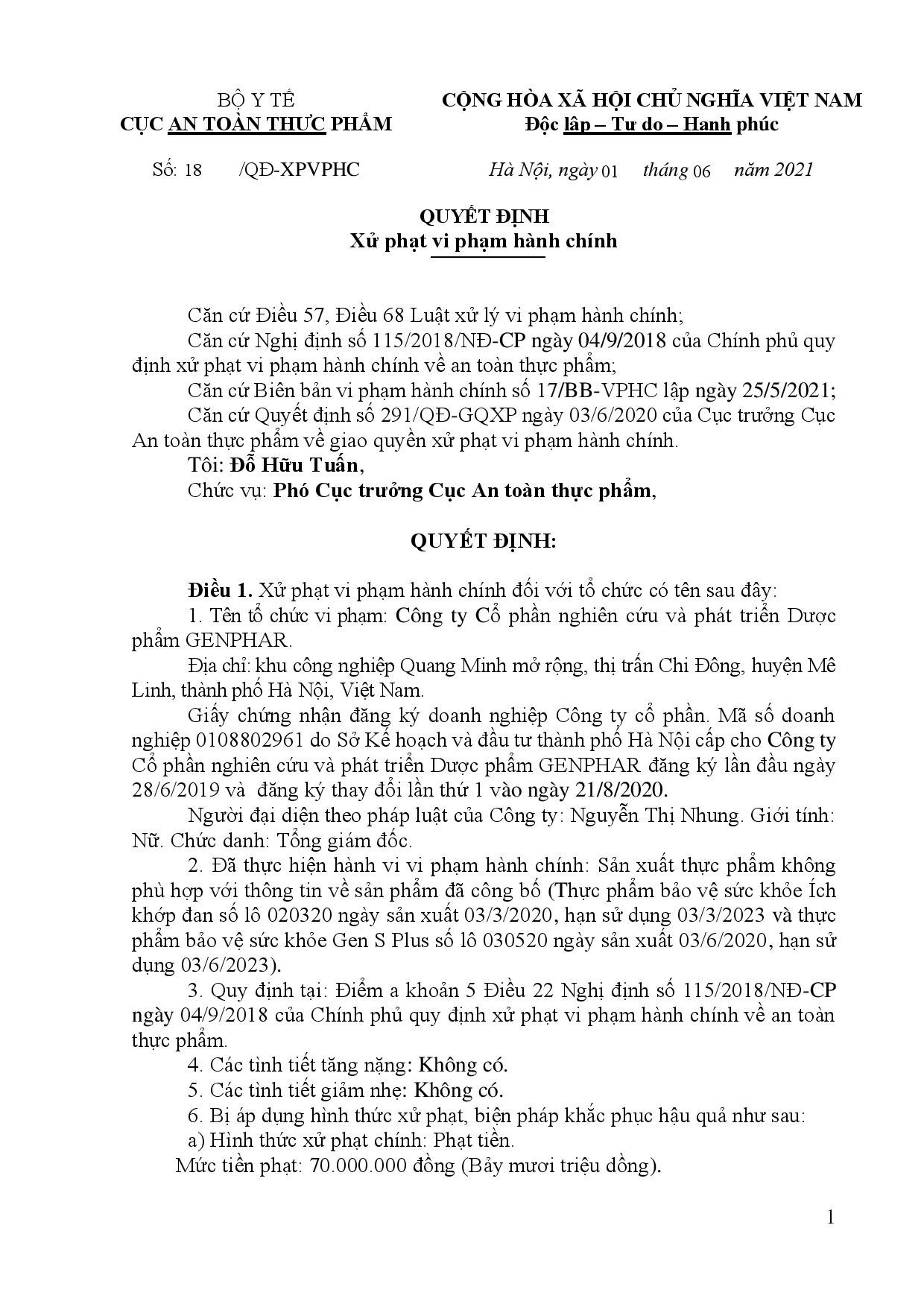 Ngày 01/06, Cục An toàn thực phẩm đã ban hành quyết định số 18/QĐ-XPVPHC xử phạt vi phạm hành chính đối với Công ty Cổ phần nghiên cứu và phát triển Dược phẩm GENPHAR (Dược phẩm GENPHAR).