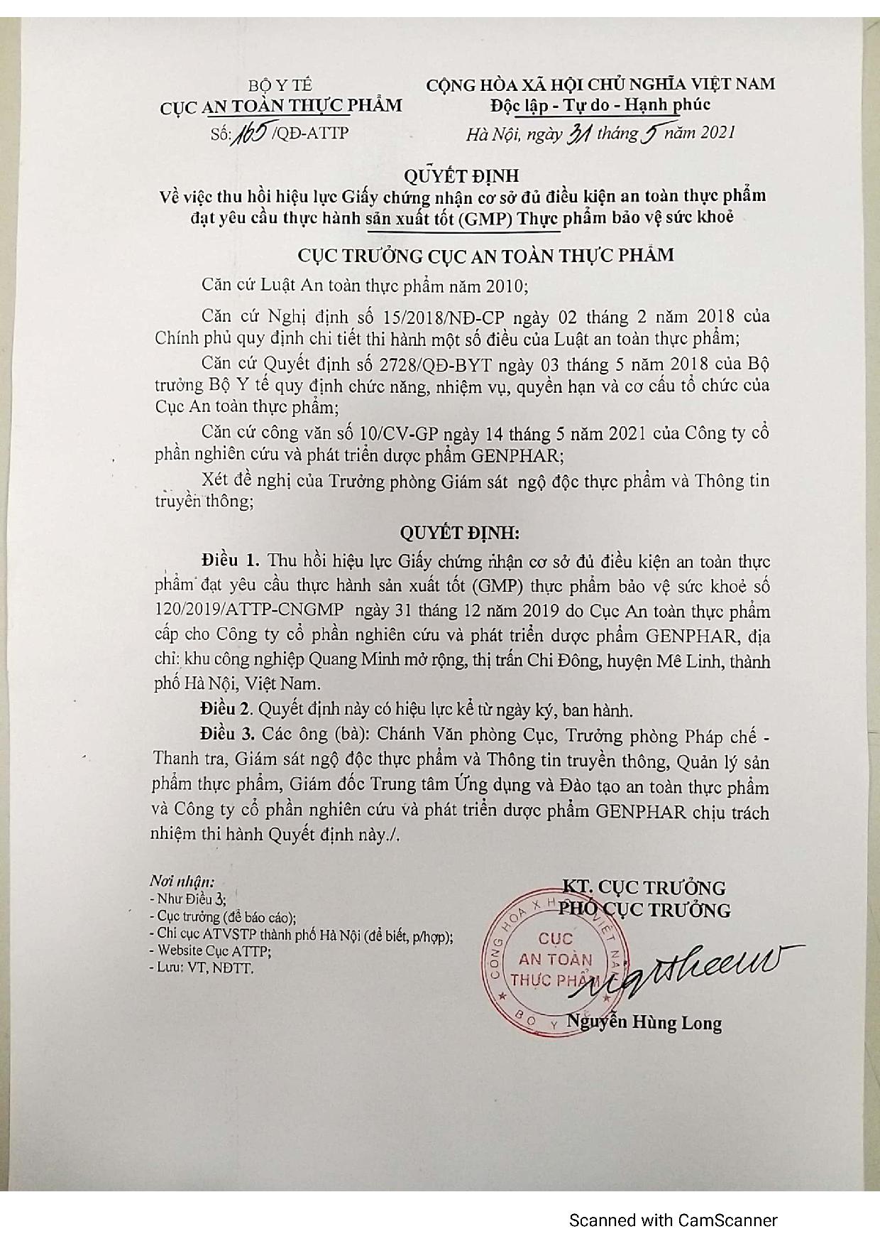 Phó Cục trưởng - Cục An toàn thực phẩm Bộ Y tế đã ký Quyết định số 165/QĐ-ATTP về việc thu hồi hiệu lực Giấy chứng nhận cơ sở đủ điều kiện ATTP đạt yêu cầu thực hành sản xuất tốt (GMP) TPBVSK số 120/2019/ATTP-CNGMP ngày 31/12/2019 do Cục ATTP đã cấp cho Công ty cổ phần nghiên cứu và phát triển Dược phẩm GENPHAR.