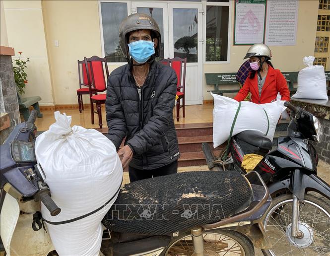 Người dân xã Quảng Khê, huyện Đắk G’Long, tỉnh Đắk Nông nhận gạo hỗ trợ của Chính phủ. Ảnh: TTXVN.