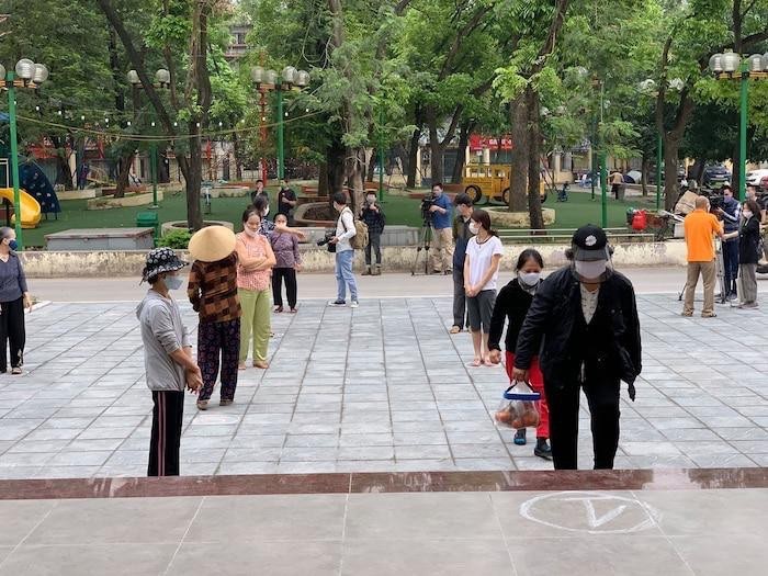 Người dân giữ đúng khoảng cách theo vị trí đã được kẻ sẵn trên sân. Ảnh: Internet