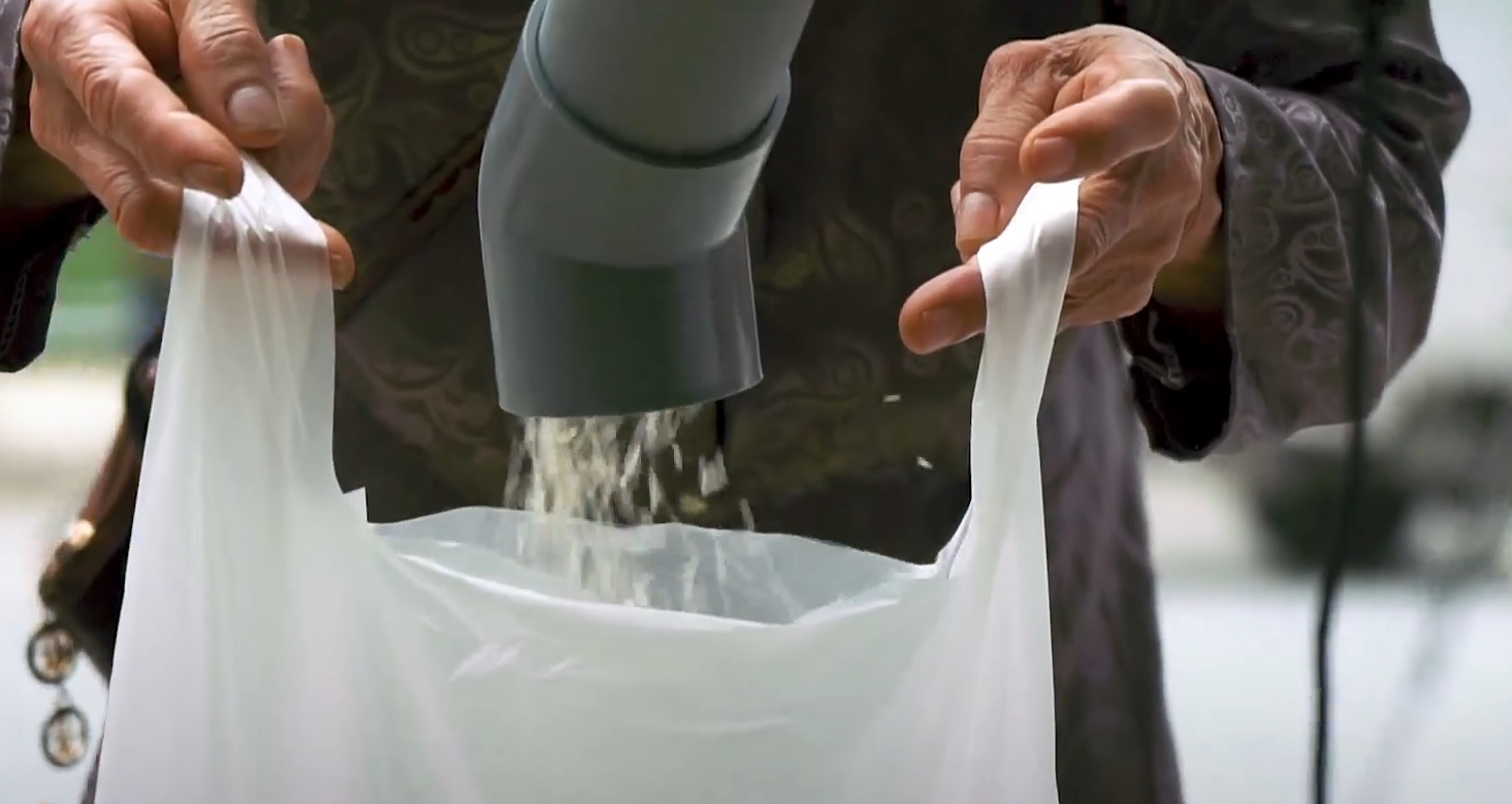 Để đảm bảo an toàn, người dân chỉ cần dùng chân nhẫm, gạo sẽ tuôn ra thay vì dùng tay bấm nút. Ảnh: Internet