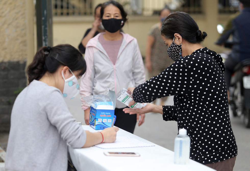 Mỗi người dân đến nhận gạo đều đeo khẩu trang và sử dụng nước diệt khuẩn trước khi vào xếp hàng nhận gạo. Ảnh: Internet