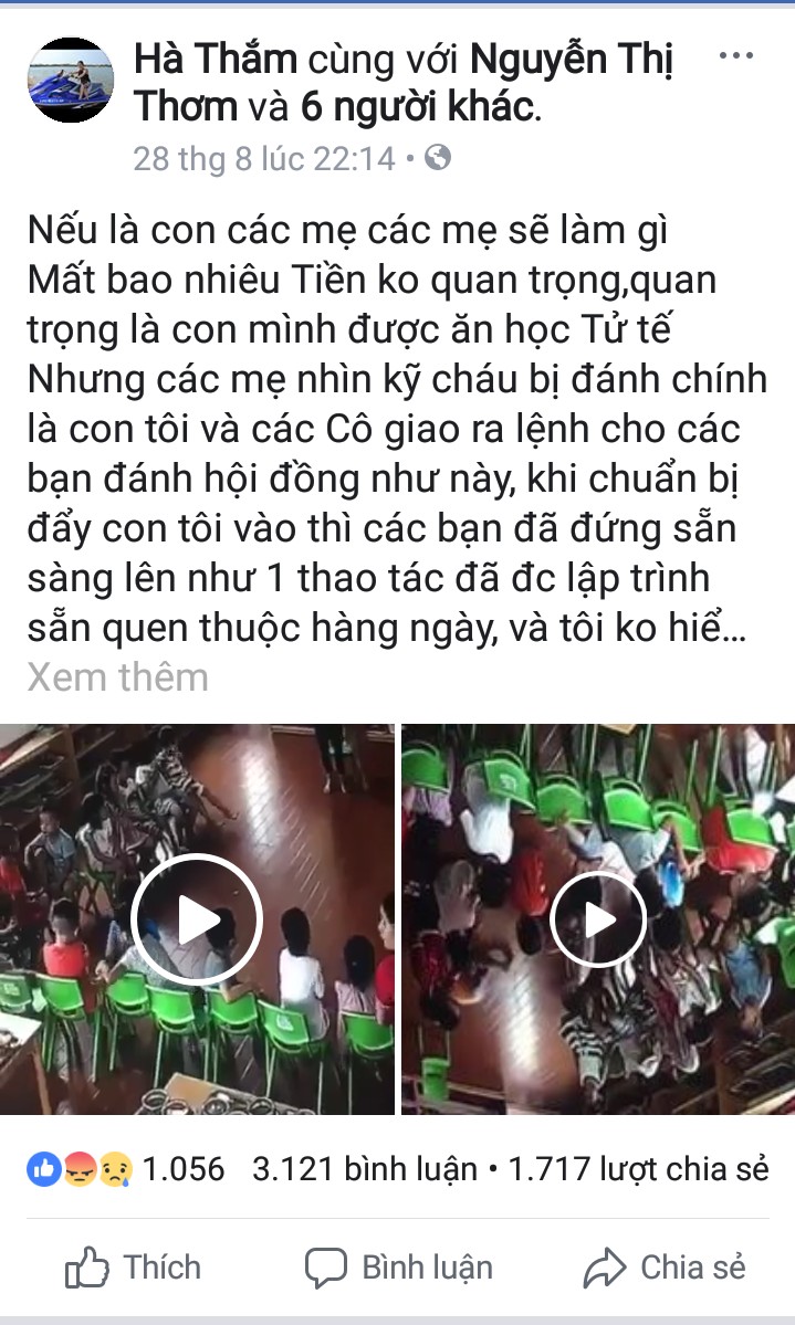 Theo tài khoản Facebook (Hà Thắm) chia sẻ và đăng tải những hành động được ghi lại đã gây ảnh hưởng nghiêm trọng tới sức khỏe của cháu bé trong clip. "Mất bao nhiêu tiền không quan trọng, quan trọng là con mình được ăn học tử tế. Nhưng các mẹ nhìn kỹ cháu bị đánh chính là con tôi và các Cô giáo ra lệnh cho các bạn đánh hội đồng như này, khi chuẩn bị đẩy con tôi vào thì các bạn đã đứng sẵn sàng lên như 1 thao tác đã được lập trình sẵn quen thuộc hàng ngày, và tôi không hiểu tại sao nhà trường có camera và phòng, ban giám hiệu, hiệu trưởng lúc nào chả theo dõi mà lại cứ để diễn ra hàng ngày như này, mà chắc chắn Là diễn ra nhiều lần.