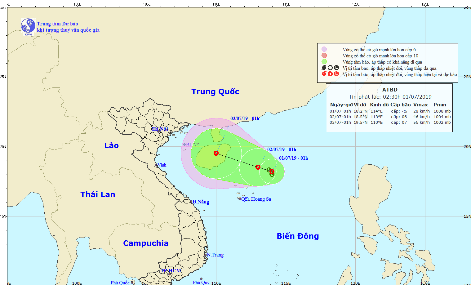 Theo thông tin từ Trung tâm Dự báo khí tượng thủy văn Quốc gia, hồi 01 giờ ngày 01/7, vị trí trung tâm vùng áp thấp ở vào khoảng 17,7-18,7 độ Vĩ Bắc; 113,5-114,5 độ Kinh Đông, ngay trên phía Đông Bắc quần đảo Hoàng Sa.