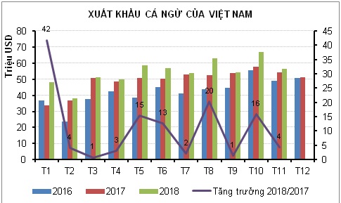 Theo Hiệp hội chế biến và xuất khẩu thủy sản Việt Nam (VASEP) XK cá ngừ của Việt Nam tăng trưởng chậm lại. Tốc độ tăng trưởng XK cá ngừ của Việt Nam trong tháng 11 chỉ đạt 4,3%, thấp hơn so với tháng 10 trước đó. Và tính đến hết tháng 11, XK cá ngừ của Việt Nam đạt 597 triệu USD, tăng 10,3% so với cùng kỳ năm 2017.