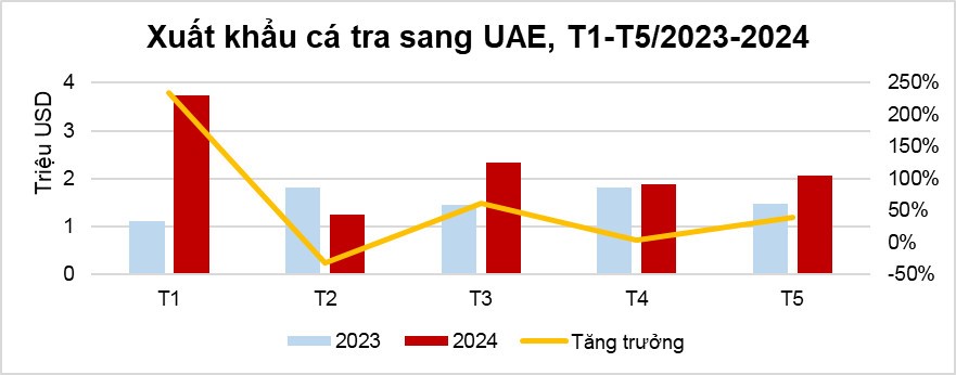 Theo số liệu của Hải quan Việt Nam, tháng 5/2024, kim ngạch xuất khẩu cá tra Việt Nam sang UAE đạt hơn 2 triệu USD, tăng 40% so với tháng 5/2024. Lũy kế xuất khẩu cá tra 5 tháng đầu năm nay sang thị trường này đạt hơn 11 triệu USD, tăng 47% so với cùng kỳ năm ngoái.