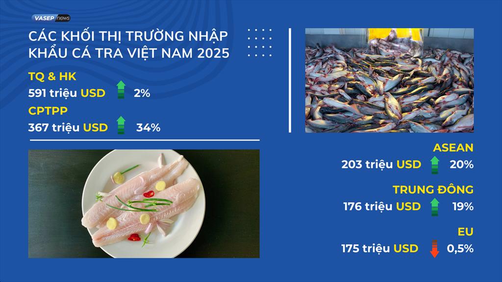 Tại châu Âu, xuất khẩu cá tra trong tháng cuối năm đạt 16 triệu USD, tăng nhẹ 2% so với cùng kỳ. Cả năm 2025, kim ngạch xuất khẩu sang EU đạt khoảng 175 triệu USD, giảm 1% so với năm trước, song được đánh giá là tín hiệu cải thiện so với giai đoạn suy giảm mạnh trước đó.
