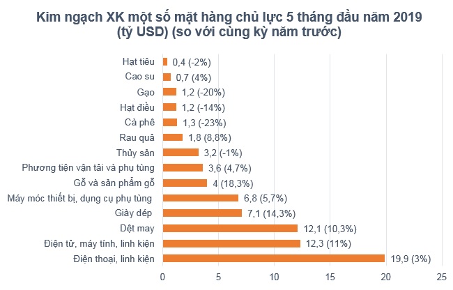Trong 5 tháng qua, kim ngạch hàng hóa xuất khẩu ước đạt hơn 100 tỷ USD, tăng 6,7% so với cùng kỳ năm trước, thấp hơn nhiều mức tăng 19% và 17,5% của 5 tháng đầu năm 2017 và 2018.