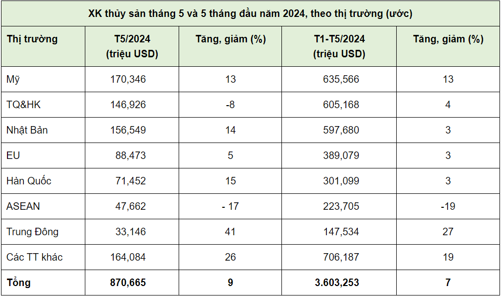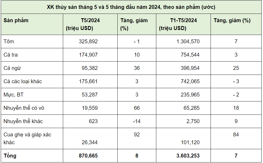 Theo thống kê của Hiệp hội Chế biến và Xuất khẩu thủy sản Việt Nam (VASEP), tháng 5/2024, xuất khẩu (XK) thủy sản của cả nước ước đạt 870 triệu USD, tăng trên 7% so với cùng kỳ năm ngoái. XK cá ngừ và cua ghẹ tiếp tục bứt phá mạnh mẽ, trong khi XK cá tra, mực, bạch tuộc tăng nhẹ. Riêng mặt hàng tôm thấp hơn một chút so với cùng kỳ năm ngoái. Lũy kế 5 tháng đầu năm, XK thủy sản đạt 3,6 tỷ USD, tăng 6,5% so với cùng kỳ năm 2023.