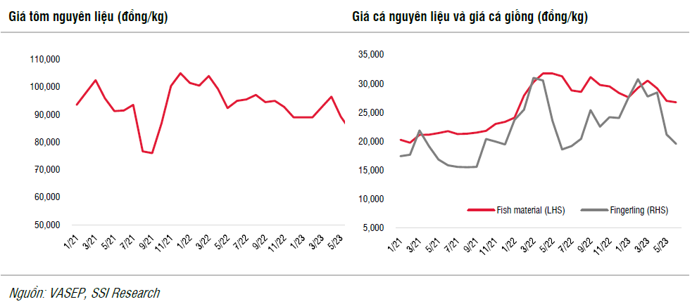 Về nguyên liệu đầu vào, SSI Research quan sát thấy sự sụt giảm ở cả tôm và cá nguyên liệu (20% giá vốn hàng bán) lần lượt là 9% và 4% so với cùng kỳ, trong khi giá thức ăn thủy sản vẫn tăng. Giá thức ăn thủy sản bình quân đạt đỉnh vào tháng 5/2023 là 14.900 đồng/kg và các công ty thức ăn chỉ bắt đầu giảm giá thức ăn thủy sản vào tháng 6/2023 (khoảng 300 đồng/kg). Như vậy, giá thức ăn thủy sản vẫn cao hơn 8% so với cùng kỳ trong 6 tháng đầu năm 2023.