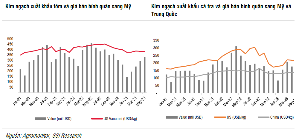 SSI Research ước tính giá bán trung bình của tôm và cá tra sang Mỹ lần lượt đạt 10,6 USD/kg (-12% so với cùng kỳ) và 3,5 USD/kg (-26% so với cùng kỳ). Còn theo Agromonitor, sản lượng tiêu thụ cá tra sang Mỹ và Trung Quốc lần lượt giảm -50% và -31% so với cùng kỳ trong nửa đầu năm 2023.