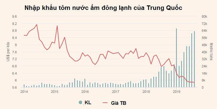 Theo số liệu của Hải quan Trung Quốc, tháng 8/2019, Trung Quốc NK 63.000 tấn tôm nước ấm đông lạnh, trị giá 372 triệu USD. Tám tháng đầu năm nay, Trung Quốc NK 378.000 tấn, trị giá 2,29 tỷ USD tôm nước ấm đông lạnh, tăng 234% về khối lượng và 185% về giá trị so với cùng kỳ năm ngoái.