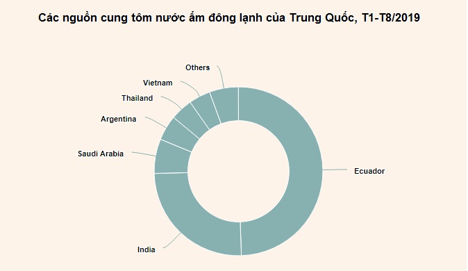 Ecuador là nguồn cung tôm nước ấm đông lạnh lớn nhất của Trung Quốc, chiếm khoảng 50% tổng NK tôm loại này vào Trung Quốc. Ấn Độ đứng thứ hai, chiếm 25% và Ả Rập Saudi là nguồn cung tôm nước ấm đông lạnh lớn thứ 3 cho Trung Quốc, chiếm 7%. NK tôm vào Trung Quốc từ Ecuador và Ấn Độ trong 8 tháng đầu năm nay tăng từ 200-300% so với cùng kỳ năm ngoái.