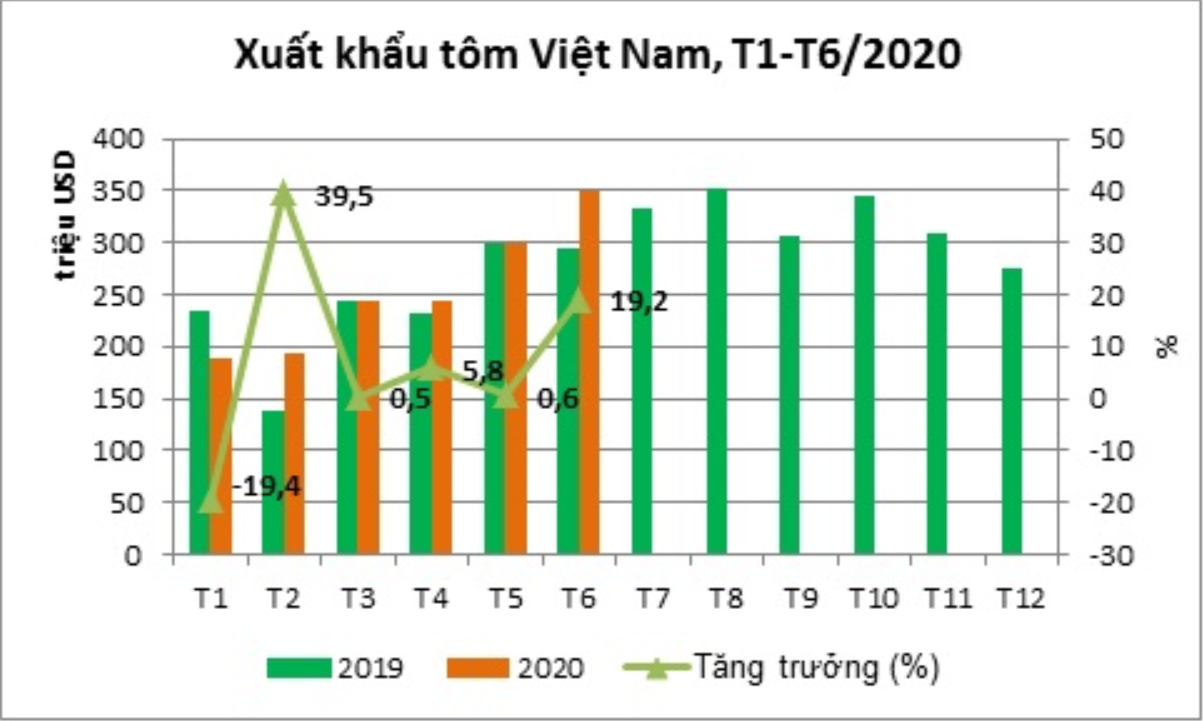Tháng 6/2020, xuất khẩu tôm Việt Nam đạt 349,9 triệu USD, tăng 19,2% so với tháng 6/2019. Đây là mức tăng trưởng tốt nhất kể từ tháng 3/2020. Lũy kế 6 tháng đầu năm nay, XK tôm đạt 1,5 tỷ USD, tăng 5,7% so với cùng kỳ năm ngoái. Đây là kết quả đáng khích lệ trong bối cảnh dịch Covid-19 vẫn còn tiếp diễn ở các thị trường chính.