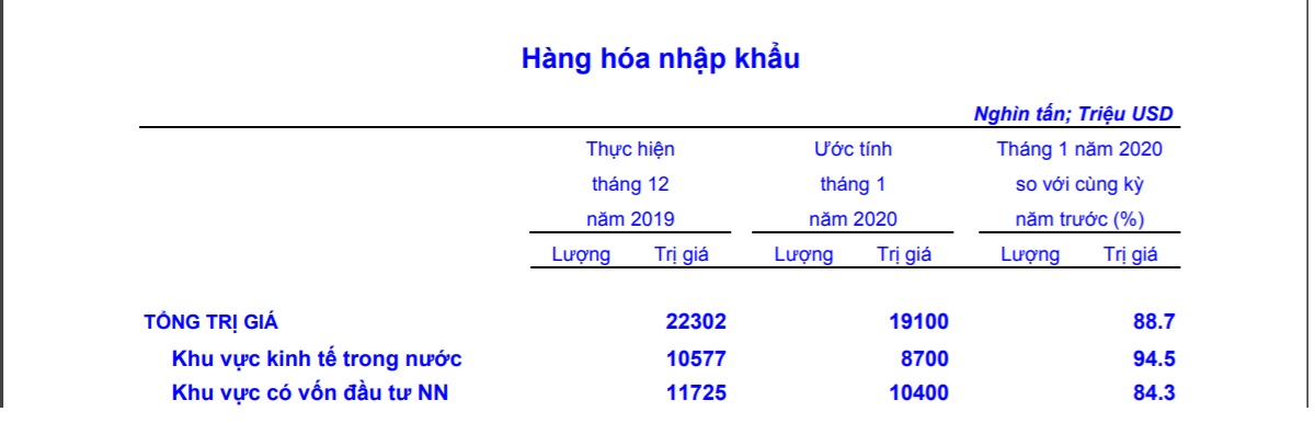 Kim ngạch hàng hóa nhập khẩu tháng 1/2020 ước tính đạt 19,1 tỷ USD, giảm 14,4% so với tháng trước, trong đó khu vực kinh tế trong nước đạt 8,7 tỷ USD, giảm 17,7%; khu vực có vốn đầu tư nước ngoài đạt 10,4 tỷ USD, giảm 11,3%.
