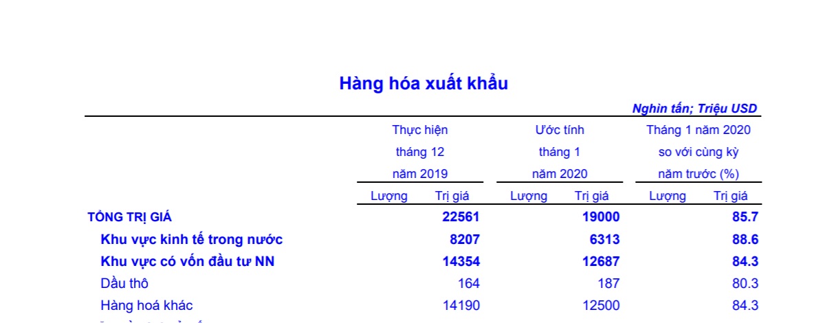 Kim ngạch hàng hóa xuất khẩu tháng 1/2020 ước tính đạt 19,0 tỷ USD, giảm 15,8% so với tháng trước, trong đó khu vực kinh tế trong nước đạt 6,31 tỷ USD, giảm 23,1%; khu vực có vốn đầu tư nước ngoài (kể cả dầu thô) đạt 12,69 tỷ USD, giảm 11,6%.