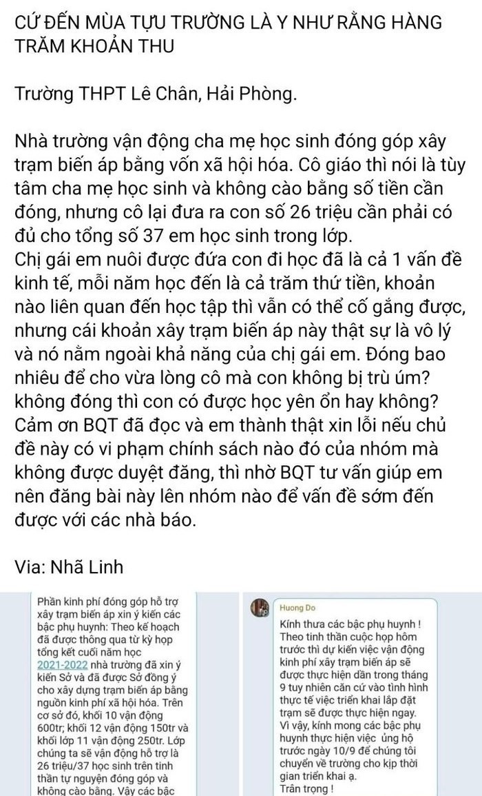 Trước đó, mạng xã hội đăng tải nội dung trường THPT Lê Chân vận động cha mẹ học sinh đóng góp xây trạm biến áp bằng vốn xã hội hoá với nội dung: "Cô giáo nói tuỳ tâm cha mẹ học sinh và không cào bằng số tiền cần đóng, nhưng cô lại đưa ra con số 26 triệu cần phải có đủ cho tổng số 37 em học sinh trong lớp".