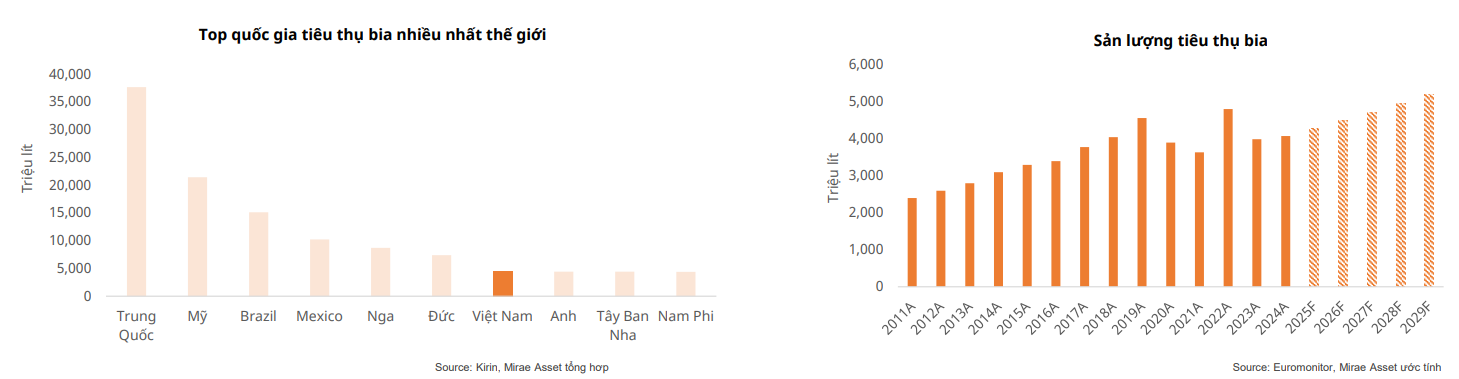 Thị trường bia tại Việt Nam vẫn đang trong quá trình thích nghi với các quy định nghiêm ngặt hơn về nồng độ cồn khi tham gia giao thông và đà phục hồi tiêu dùng bia còn tương đối chậm. Tuy nhiên, Mirae Asset kỳ vọng sản lượng tiêu thụ bia tại Việt Nam sẽ đạt tốc độ tăng trưởng kép hàng năm (CAGR) khoảng 5% trong giai đoạn 2025–2030, nhờ nền tảng nhu cầu tiêu dùng nội địa vững chắc.