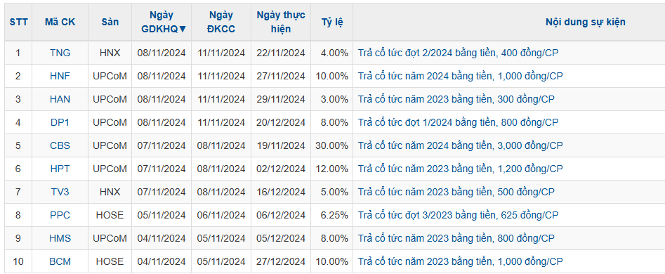 Thống kê trong tuần 4/11– 8/11, có 10 doanh nghiệp thông báo chốt quyền cổ tức bằng tiền mặt trong tuần này, mức cao nhất là 30% và thấp nhất là 3%.