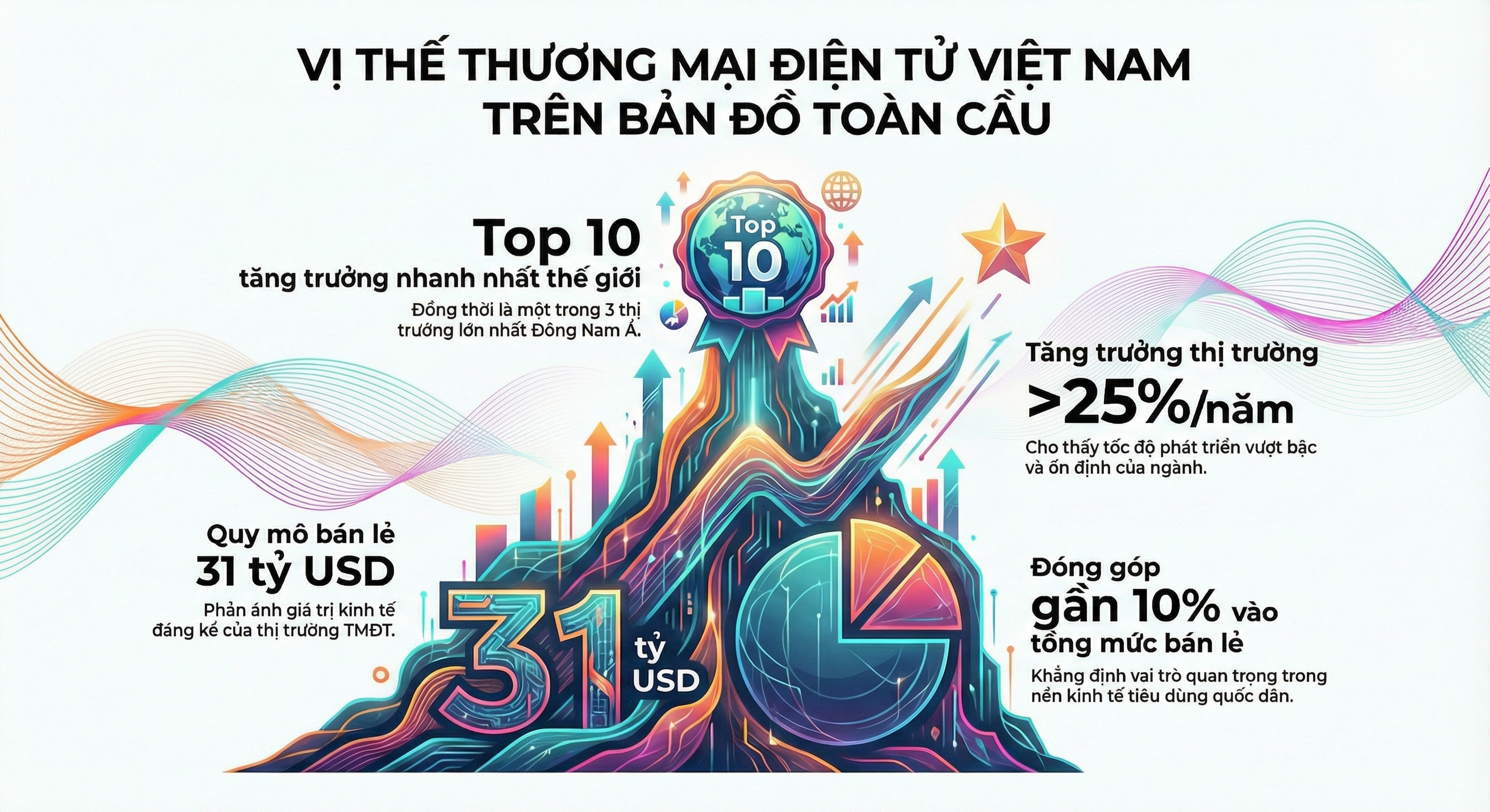 Thương mại điện tử Việt Nam năm 2025 tiếp tục thăng hoa, khẳng định vai trò trụ cột của kinh tế số. Quy mô thị trường ước tính vượt 31 tỷ USD, tăng gấp hơn 2 lần so với năm 2020; chiếm khoảng 10% tổng mức bán lẻ hàng hóa và doanh thu dịch vụ tiêu dùng cả nước, ⅔ kinh tế số. Việt Nam tiếp tục nằm trong nhóm 10 quốc gia tăng trưởng thương mại điện tử nhanh nhất thế giới, với tốc độ trung bình 20–25%/năm bất chấp đại dịch và biến động kinh tế.