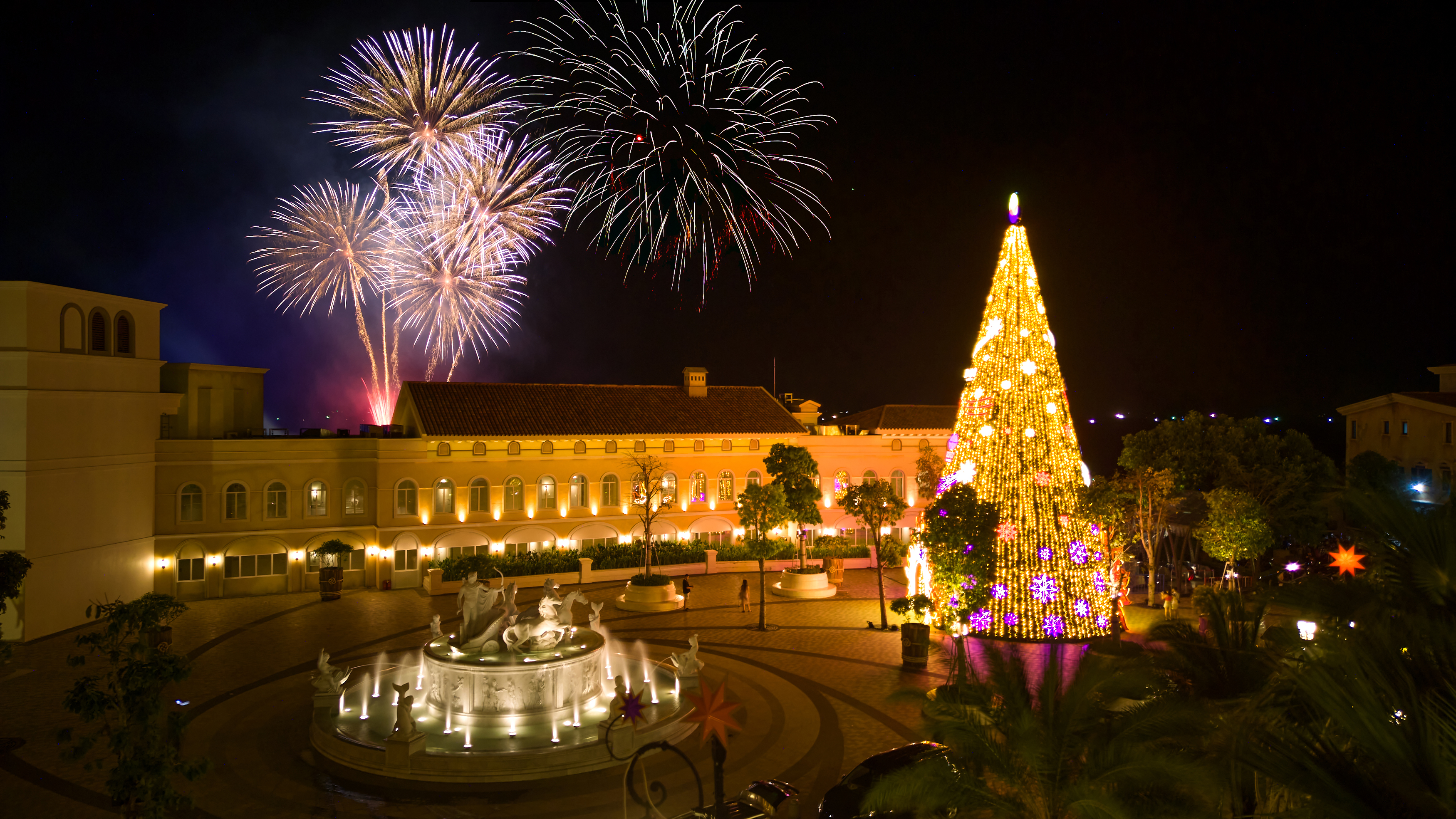 Ngay sau Lễ thắp sáng cây thông, màn trình diễn pháo hoa ngoạn mục kéo dài 7 phút sau show diễn công nghệ đa phương tiện Kiss of the Sea (diễn ra vào 8h30 mỗi tối tại sân khấu trên màn nước biển lớn nhất thế giới ngay tại Thị trấn Hoàng Hôn Sunset Town) đã chính thức đưa Phú Quốc thành hòn đảo đầu tiên trên thế giới có show diễn công nghệ kết hợp bắn pháo hoa hàng đêm.