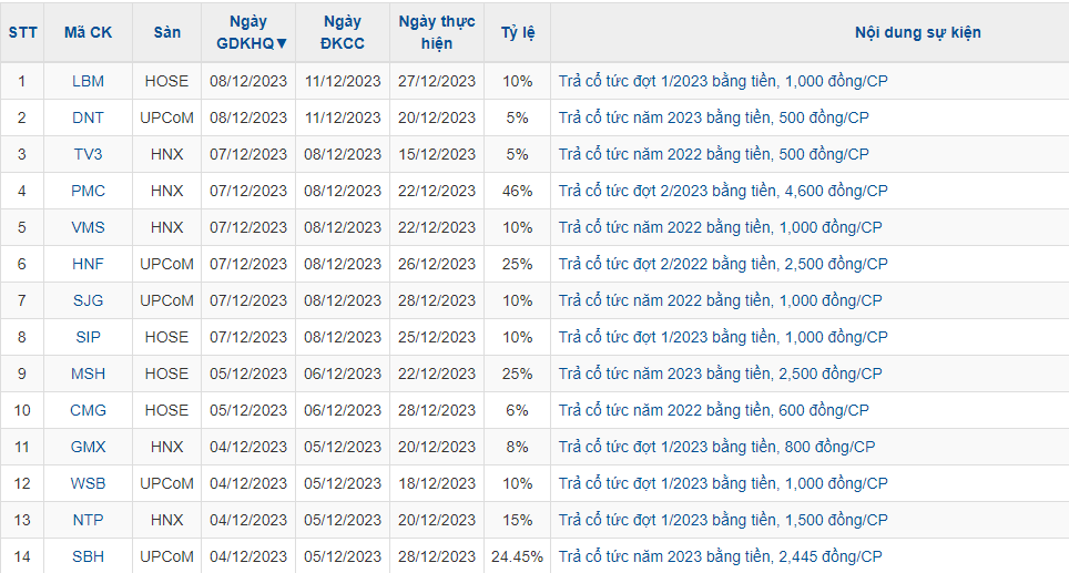 Trong tuần ngày 4/12 đến 8/12, thị trường có 16 doanh nghiệp chốt ngày giao dịch không hưởng quyền để nhận cổ tức bằng tiền mặt.