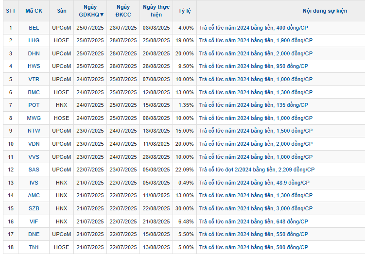 Theo thống kê, có 18 doanh nghiệp thông báo chốt quyền cổ tức bằng tiền mặt trong tuần 21/7-25/7, mức cao nhất là 30% và thấp nhất là 0,5%.