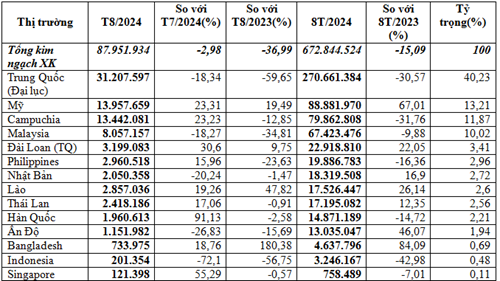 Riêng tháng 8/2024 xuất khẩu đạt trên 87,95 triệu USD, giảm 3% so với tháng 7/2024 và giảm 37% so với tháng 8/2023.