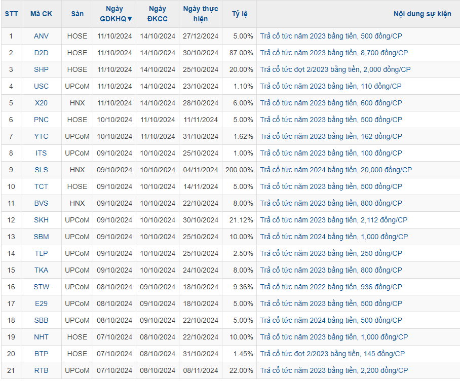 Tuần từ 7/10 - 11/10, trên thị trường chứng khoán Việt Nam có 21 doanh nghiệp chốt quyền nhận cổ tức bằng tiền mặt. Doanh nghiệp nổi bật nhất trong tuần tới là SLS (Mía đường Sơn La) với tỷ lệ 200%, tức mỗi cổ phiếu nhận được 20.000 đồng, là mức cổ tức kỷ lục của Doanh nghiệp.