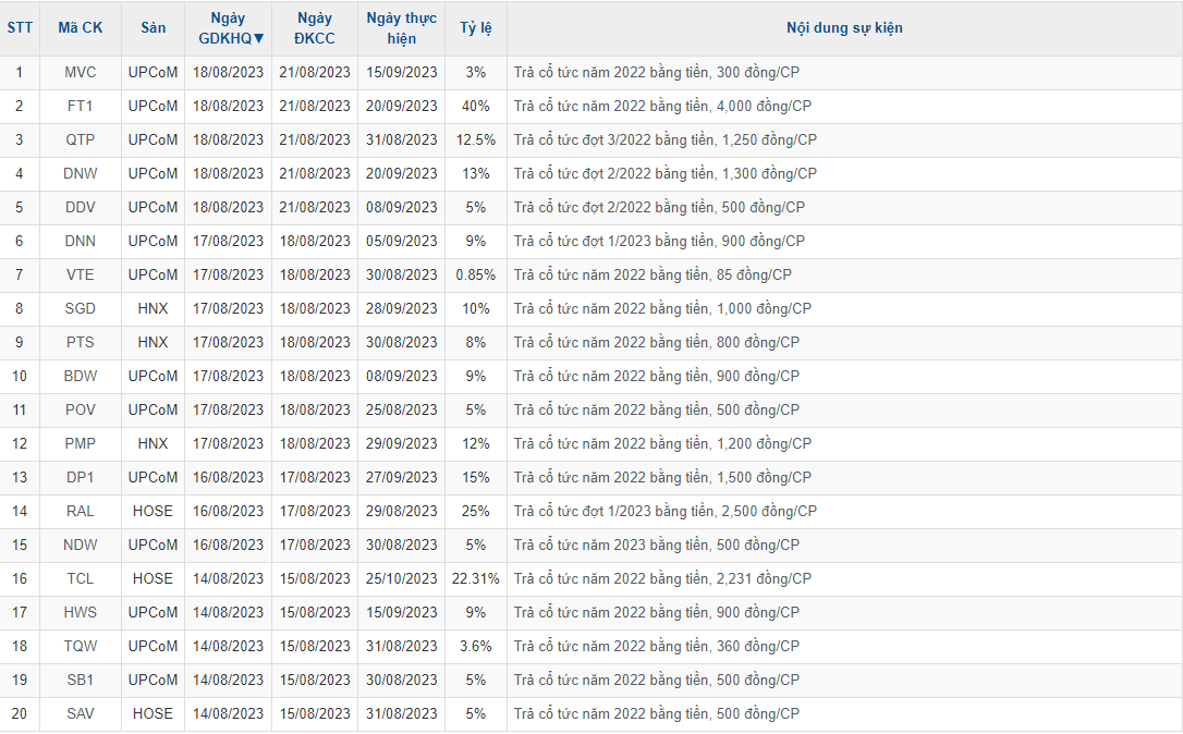 Tuần từ 14/8- 18/8, trên thị trường chứng khoán Việt Nam có 23 doanh nghiệp chốt quyền nhận cổ tức bằng tiền mặt. Trong số đó doanh nghiệp trả cổ tức tỷ lệ cao như CTCP Phụ tùng Máy số 1 (UPCoM: FT1) trả tỷ lệ 40%.