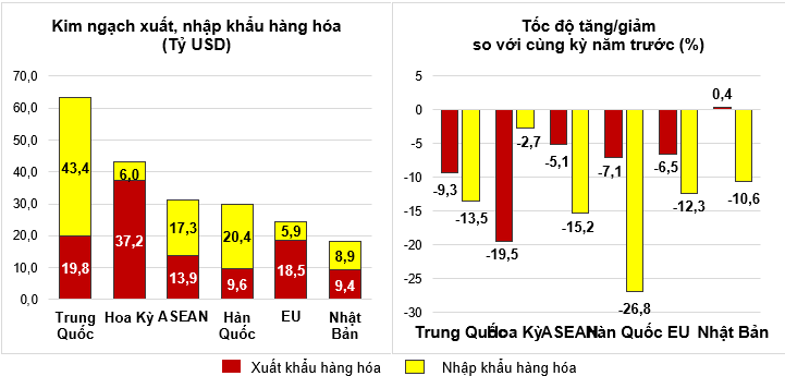 Về thị trường xuất, nhập khẩu hàng hóa 5 tháng đầu năm 2023, Hoa Kỳ là thị trường xuất khẩu lớn nhất của Việt Nam với kim ngạch ước đạt 37,2 tỷ USD. Trung Quốc là thị trường nhập khẩu lớn nhất của Việt Nam với kim ngạch ước đạt 43,4 tỷ USD. Trong 5 tháng đầu năm 2023, xuất siêu sang Mỹ ước đạt 31,2 tỷ USD, giảm 22% so với cùng kỳ năm trước; xuất siêu sang EU 12,6 tỷ USD, giảm 3,6%; xuất siêu sang Nhật Bản 521 triệu USD (cùng kỳ nhập siêu 564 triệu USD); nhập siêu từ Trung Quốc 23,6 tỷ USD, giảm 16,7%; nhập siêu từ Hàn Quốc 10,8 tỷ USD, giảm 38,3%; nhập siêu từ ASEAN 3,4 tỷ USD, giảm 41,3%.