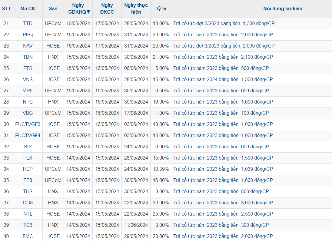 CTCP Bến bãi Vận tải Sài Gòn (Mã TPS): Ngày 14/5/2024 là ngày đăng ký cuối cùng để chốt danh sách nhận cổ tức bằng tiền năm 2023 tỷ lệ 25% (1 cổ phiếu được nhận 2.500 đồng). Ngày thanh toán là 4/6/2024.